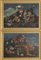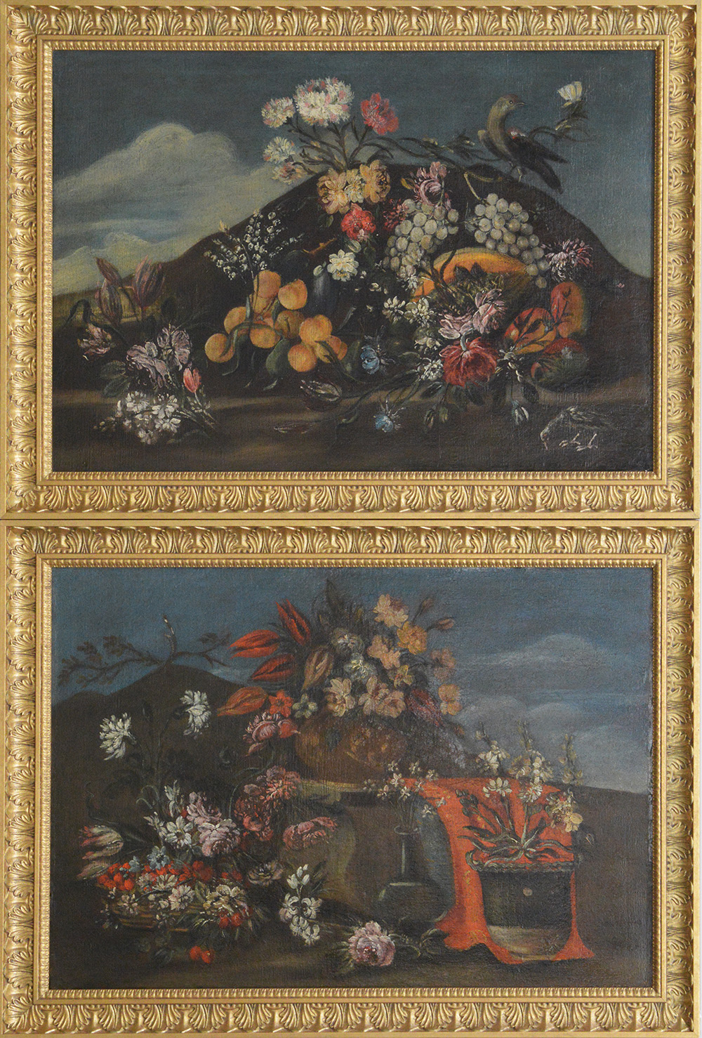 Scuola del secolo XX "Composizioni con frutta, fiori e volatili in un paesaggio" coppia di dipinti ad olio su tela (cm 66x93) in cornici (difetti e restauri)