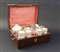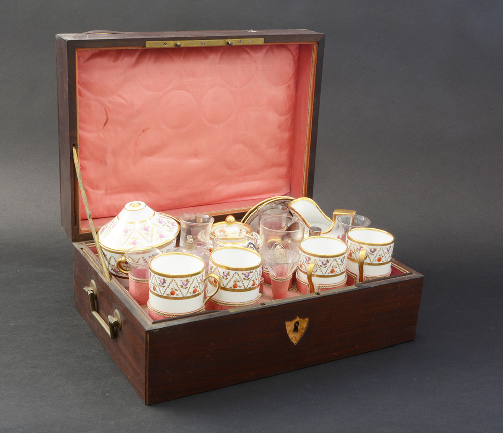 Manifattura di Vinovo, secolo XIX. Set da tè' da viaggio composto da teiera, zuccheriera, lattiera, quattro tazzine con piattini in porcellana, cucchiaini in argento e bicchieri e bottiglie in vetro. In custodia (difetti e mancanze)