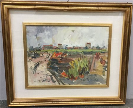 "Periferia milanese" olio su tela (cm 30x40) firmato in basso a destra, titolato al verso, in cornice (lievi difetti)