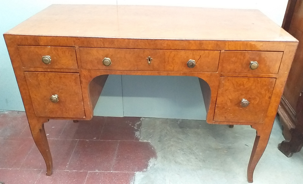 Piccolo scrittoio da centro in radica di olmo a sei cassetti sul fronte (cm 110x78x51) (lievi difetti)