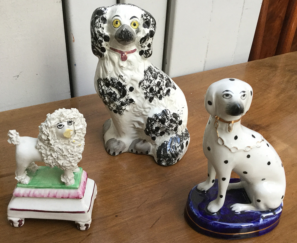 Lotto composto da tre sculturine di manifattura inglese in ceramica raffiguranti cani di misure diverse (lievi difetti)