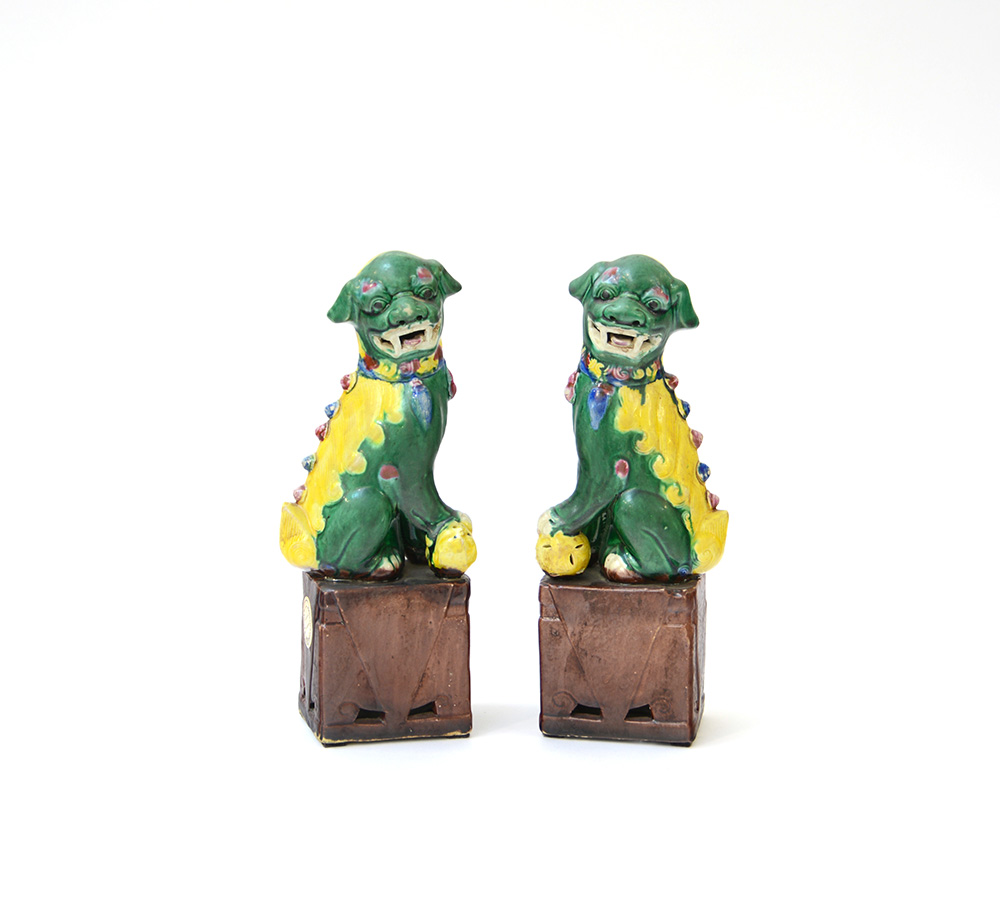 Coppia di leoni buddhisti in porcellana policroma, marchio apocrifo alla base (h cm 27) (difetti)
