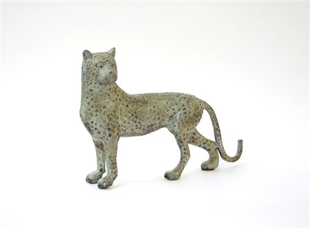 Scultura in bronzo a patina verde raffigurante un ghepardo (h 32)