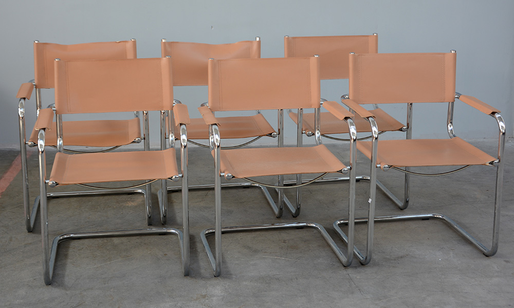 Sei poltroncine da ufficio con strutture in acciaio, sedute e spalliere in cuoio beige (difetti)