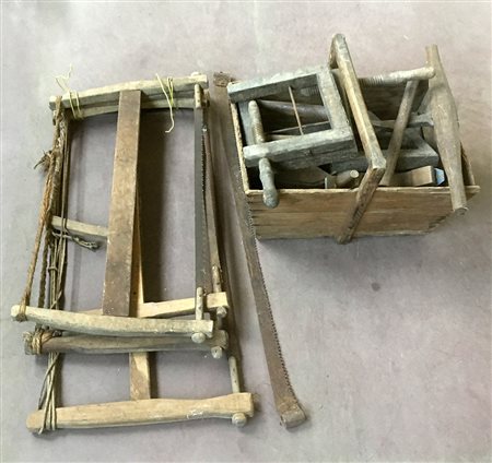 Lotto composto da una cassetta da lavoro contenente numerosi attrezzi, principalmente da falegnameria, e quattro seghe manuali (difetti)