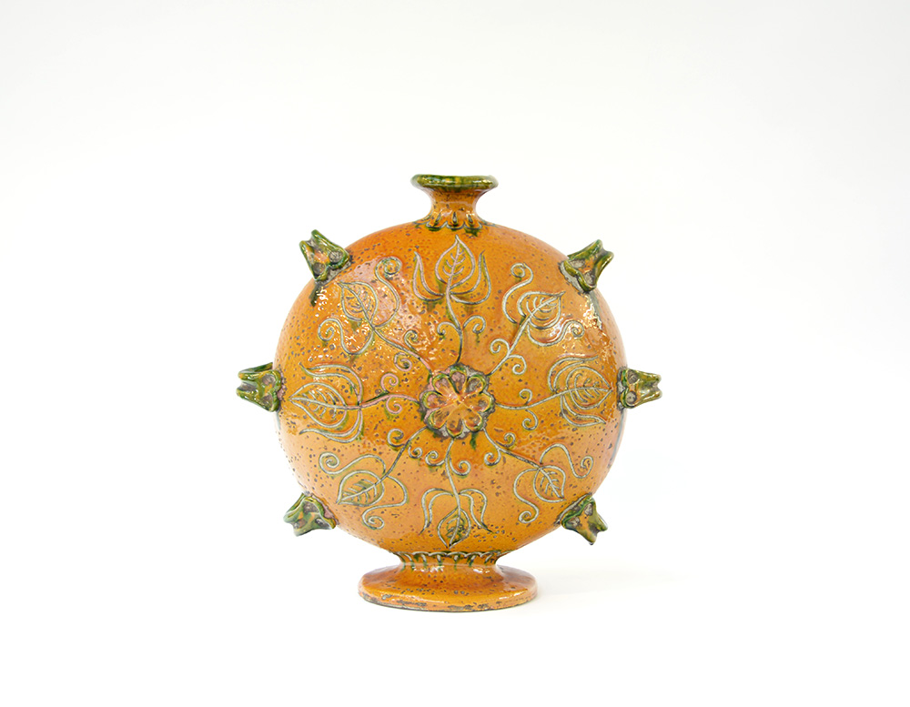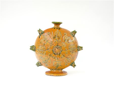 Manifattura dell'Italia meridionale, fiasca in maiolica color ocra e rilievi verdi, con anse e decori naturalistici graffiti (h cm 40) (lievi difetti)