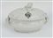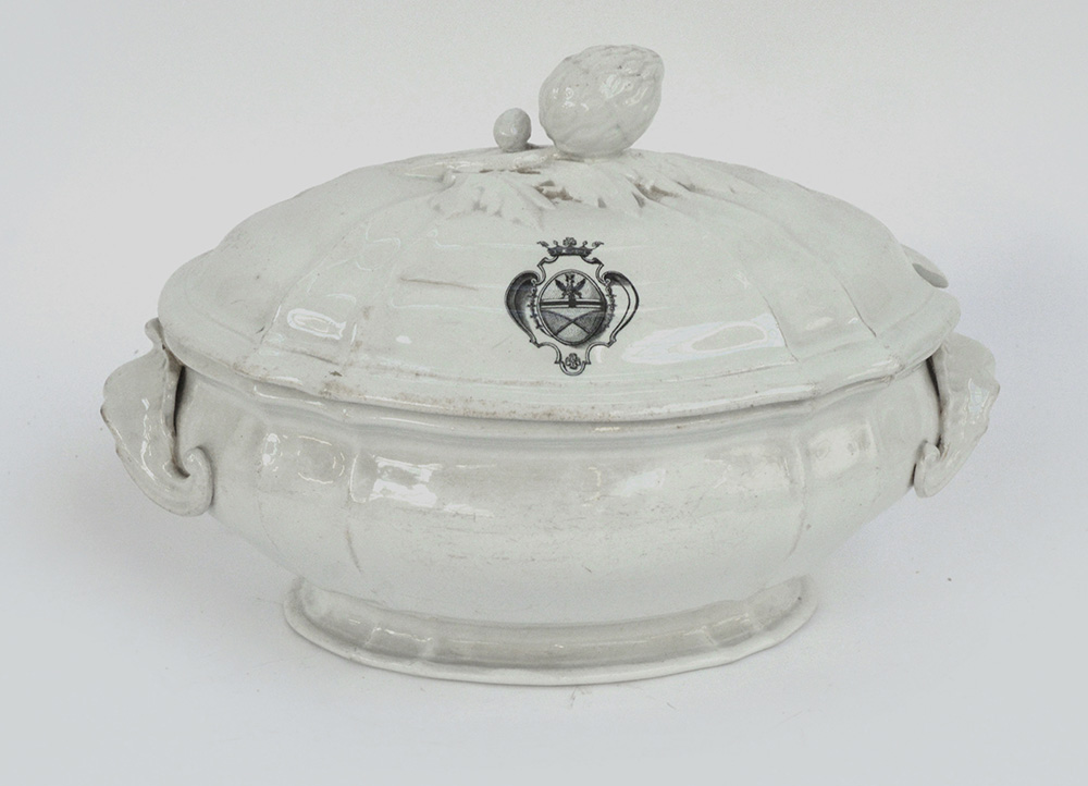 Società Ceramica Richard, secolo XX. Zuppiera biansata in ceramica decorata a stemma coronato, coperchio con presa a forma di pigna a tutto tondo (largh. cm 37) (difetti)