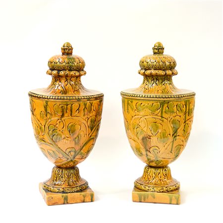 Manifattura dell'Italia centro-meridionale, coppia di vasi con coperchi in maiolica smaltata gialla e rilievi verdi, con decori naturalistici modellati e graffiti (h cm 60) (lievi difetti)