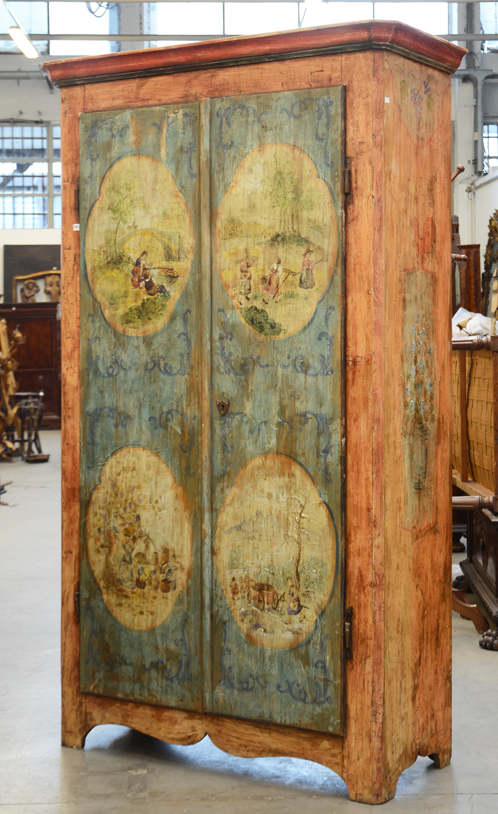 Armadio a due ante in legno laccato e decorato a scene di genere entro medaglioni (cm 110x195x50) (difetti)