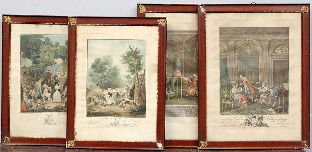 Gruppo di quattro acqueforti a colori raffiguranti scene di genere. In cornici (difetti)