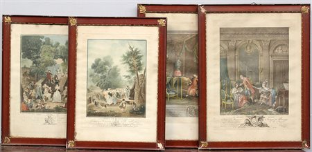 Gruppo di quattro acqueforti a colori raffiguranti scene di genere. In...