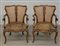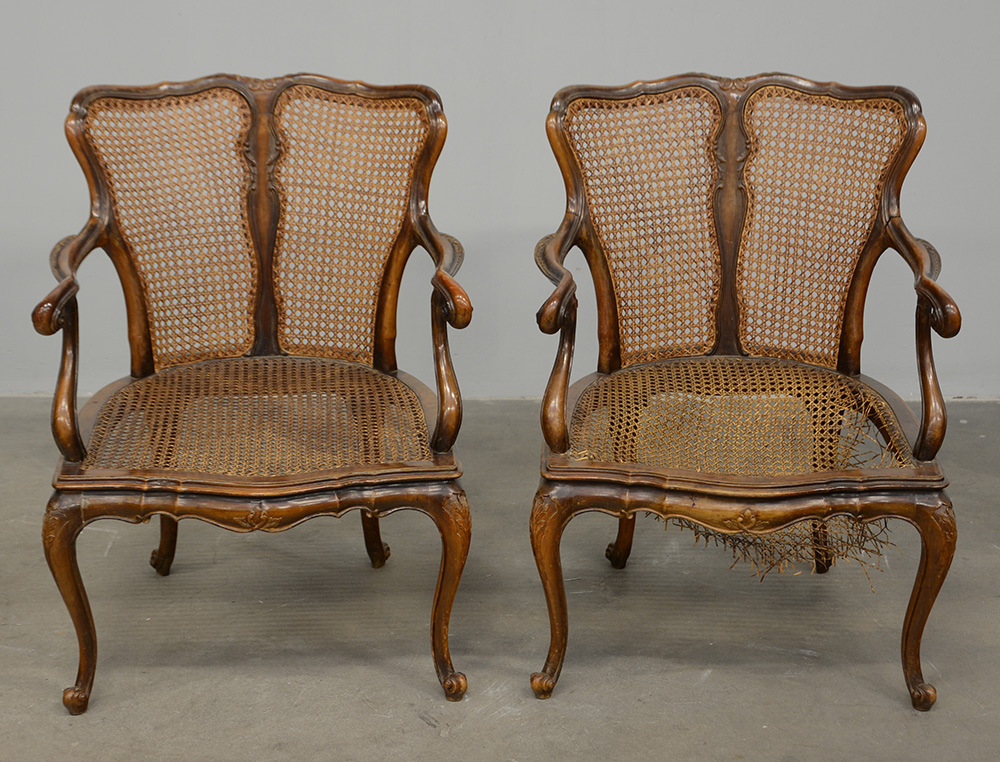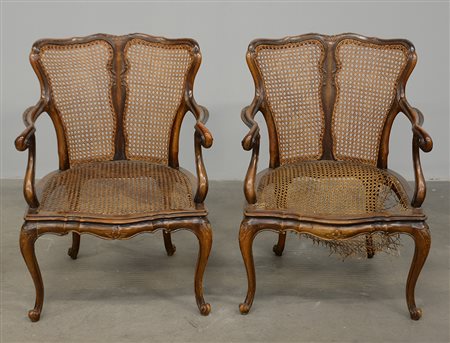 Coppia di poltroncine di forma mossa in legno intagliato con sedute e schienali in paglia di Vienna (difetti)