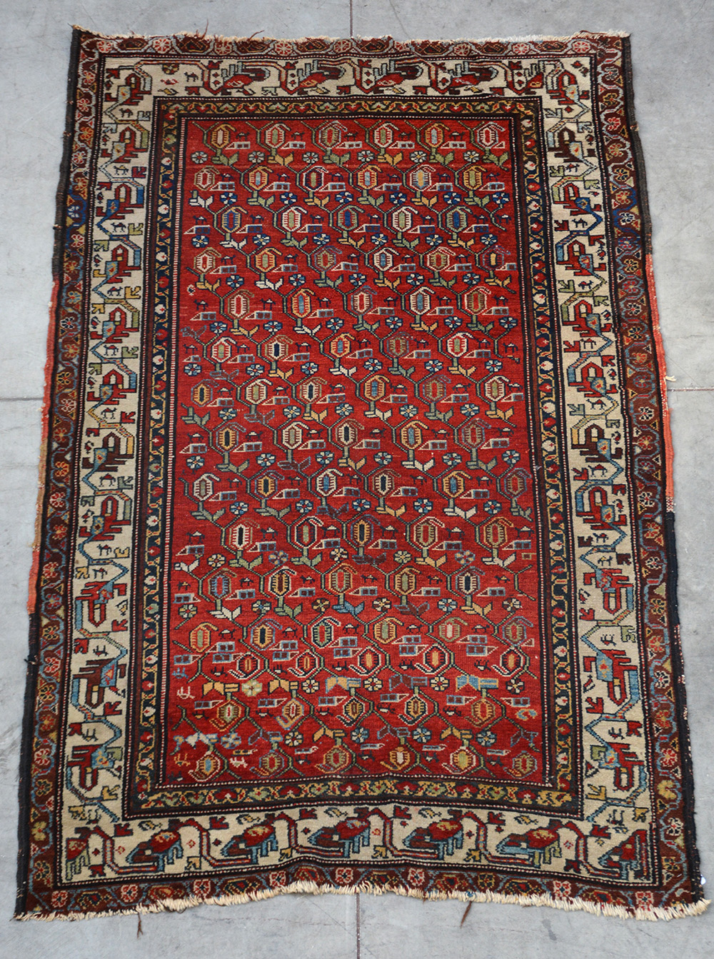 Tappeto Sarab, Persia inizio secolo XX, disegno a file di boteh su fondo rosso (cm 183x113) (difetti)