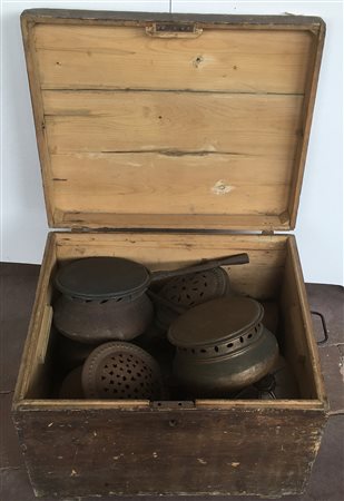 Cassa contenente numerosi scaldini ad acqua e carbonella (difetti)