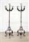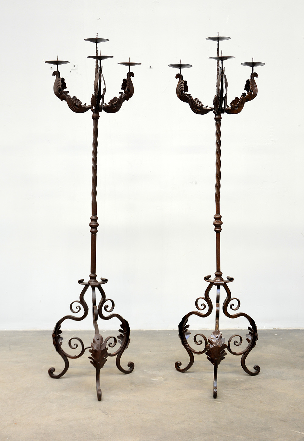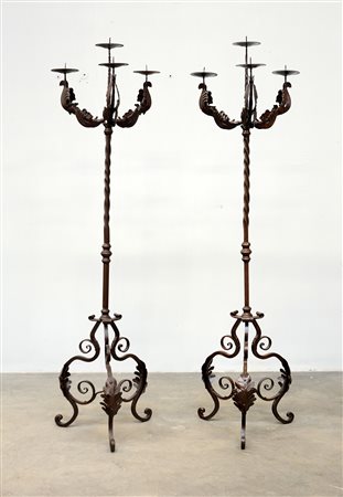 Coppia di portaceri a quattro fiamme in ferro battuto e brunito con decoro a foglie e volute (h cm 170) (lievi difetti)