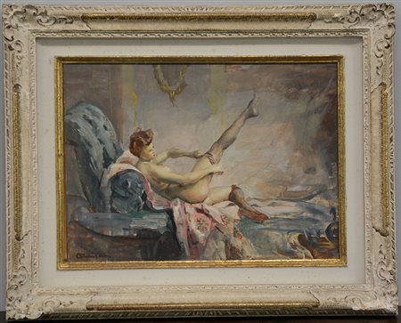 Firma indecifrata. Nudo di donna, olio su cartone pressato, firmato in basso a sinistra (cm 29x40,5) in cornice. (Lievi difetti).