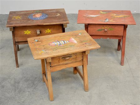 Lotto di tre tavolini rustici per fanciulli con cassetti e piani parzialmente dipinti con soggetti naturalistici (difetti)