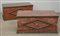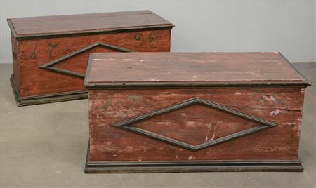 Coppia di basamenti in legno dolce verniciati in rosso con profili scuri e fronte centrata da losanga (cm 115x50x55) (difetti)