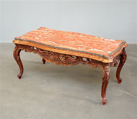 Tavolino da salotto con gambe e fascia mossa in legno intagliato e laccato, piano in marmo (cm 114x51x60) (difetti)