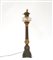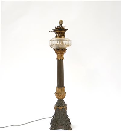 Lampada a petrolio con sostegno a colonna in metallo a decoro fogliaceo, montata a luce elettrica. Inizio secolo XX (h cm 72) (difetti e mancanze)