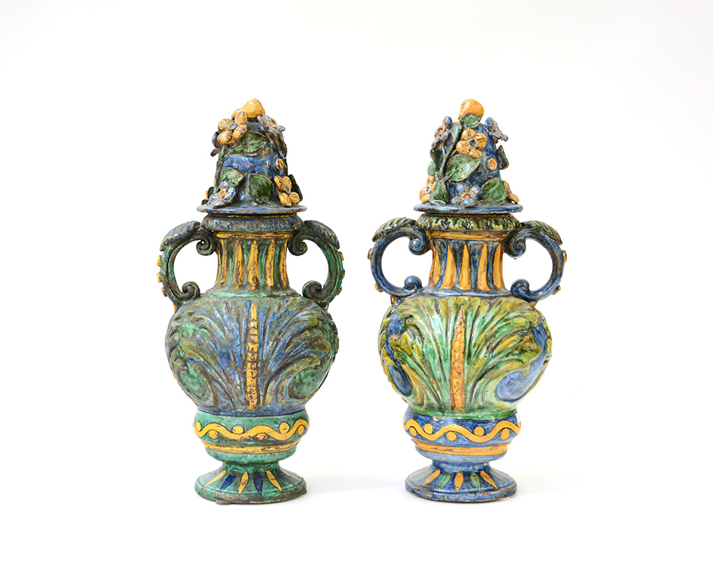 Manifattura dell'Italia centro-meridionale, coppia di vasi biansati in maiolica con coperchi a decori naturalistici in rilievo dipinti a smalto nei toni del blu, verde e giallo (h cm 48) (difetti)
