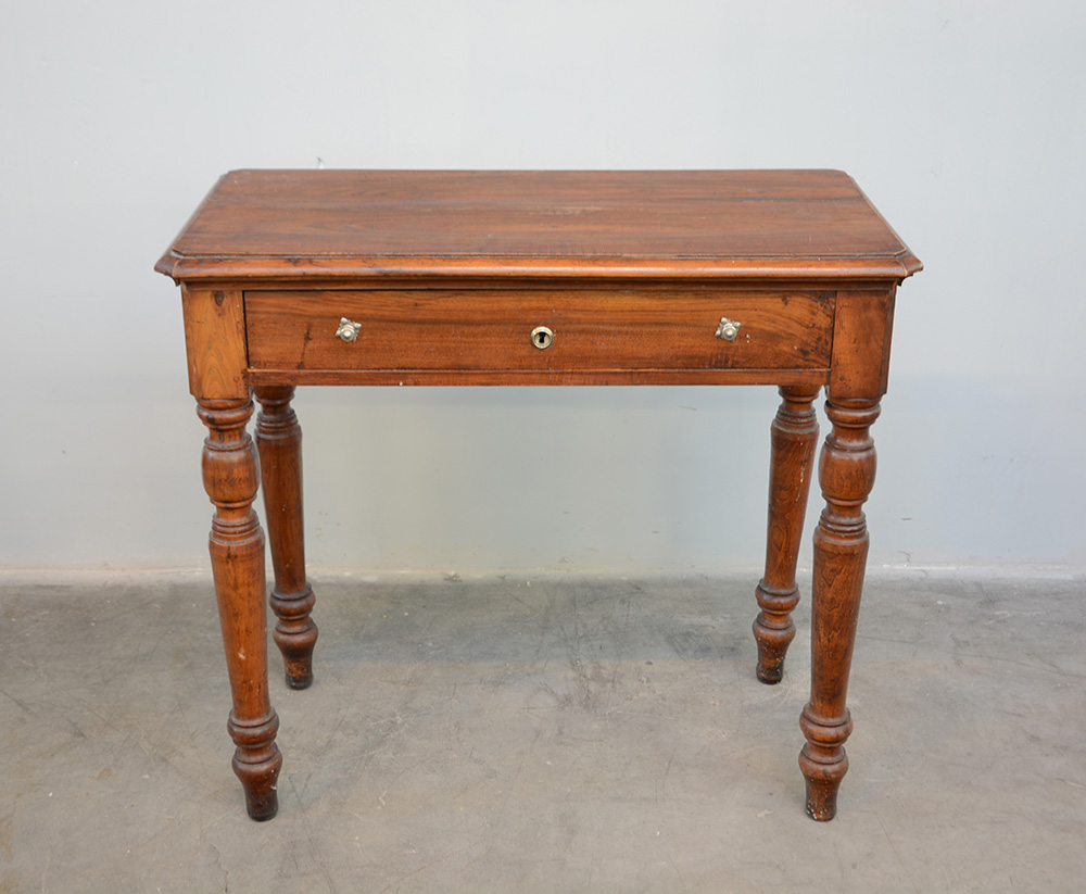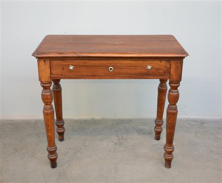 Tavolino in noce ad un cassetto con gambe tornite. Secolo XIX (cm 90x82x46,5)