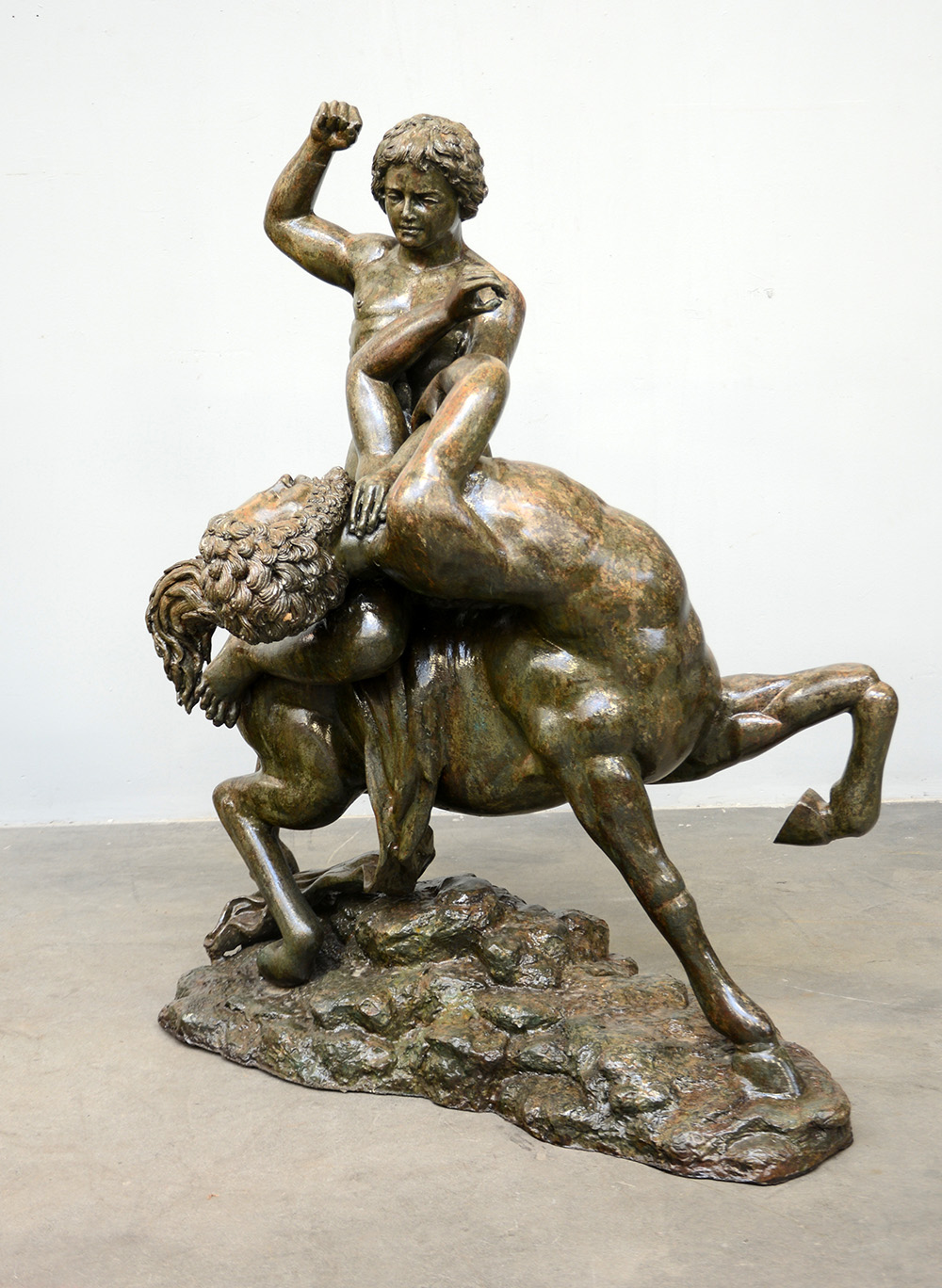 Lotto di due gruppi scultorei in bronzo patinato raffiguranti "Eros e il centauro Chirone" ed "Ercole e il centauro Nesso" (h max cm 126) (lievi difetti)