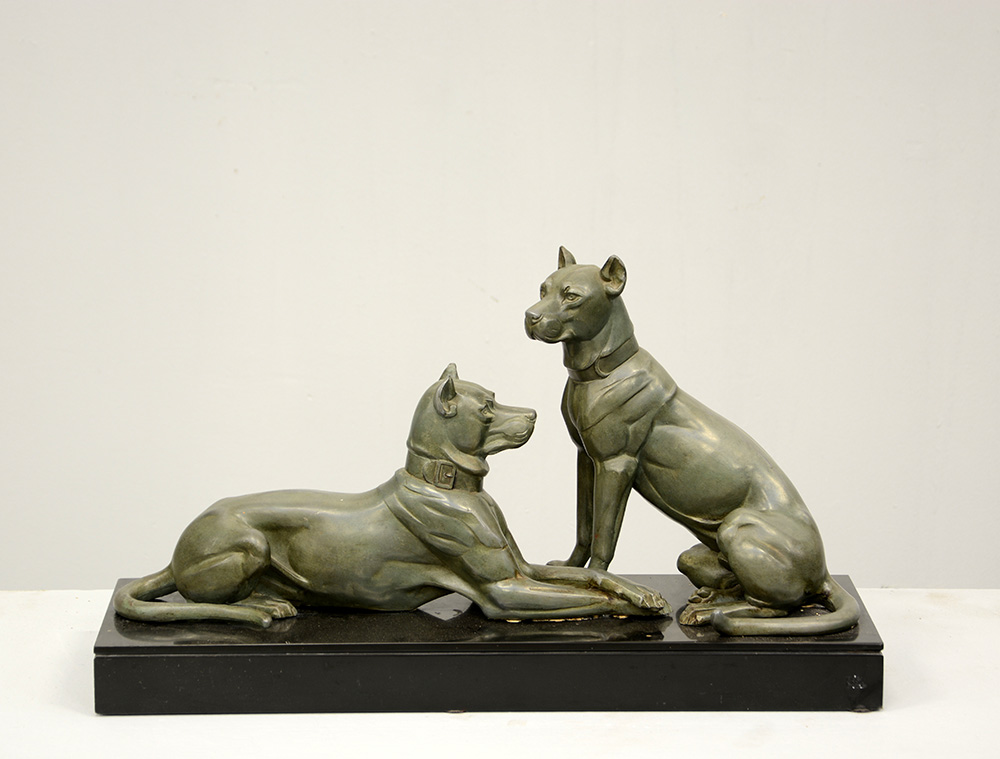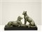Gruppo raffigurante due cani in metallo a patina verde su basi in marmo nero...