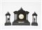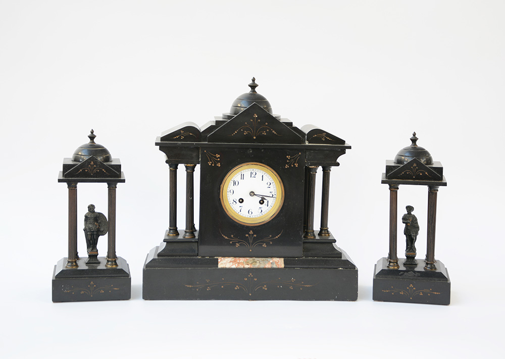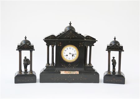 Trittico da camino in marmo nero del Belgio composto da una pendola e due elementi decorativi a tempietto contenenti sculturine di guerrieri (h max cm 41) (difetti)