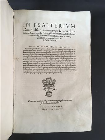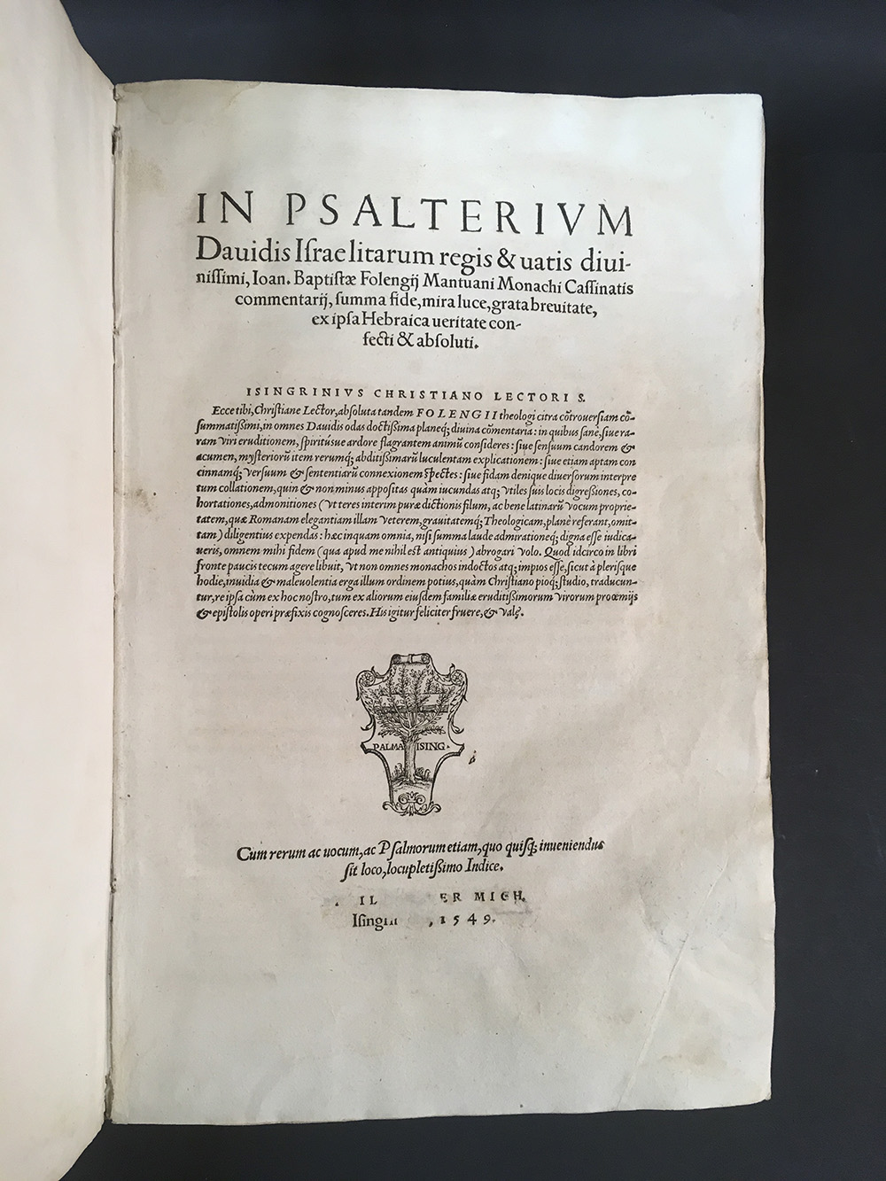 FOLENGO, Giovanni Battista. In Psalterium Dauidis Israelitarum regis. Basilea: 1549. Folio, al frontespizio e all’ultima marca xilografica dello stampatore; legatura in pergamena antica rimontata (la carta 444 è mancante quasi tutta) (difetti e mancanze)