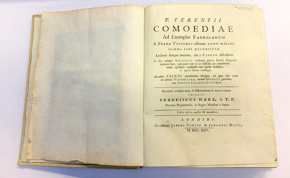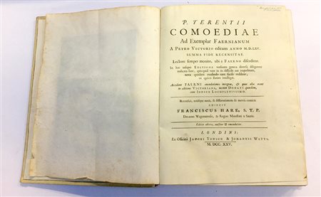 TERENZIO, Afro Publio. Comoediae ad exemplar faernianum a Petro Victorio. Londra: ex officina Jacobi Tonson & Johannis Watts, 1725. 4to, ritratto inciso di Terenzio, vignette e fregi incisi in rame, legatura coeva in pergamena rigida, piatti inquadrati da ricca cornice in oro, titolo e data su etichette al dorso con decoro in oro. Esemplare su carta forte in buono stato di conservazione. Non collazionato e difetti da esaminare.
