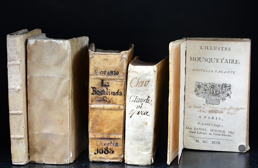 Lotto di libri di piccolo formato in pergamena che includono: MAFFEI, Giovanni Pietro. Ignatii Loiolae Vita qui Societatem Iesu fundavit, postremo recognita. Roma: Heredum Pannelli-Michaelis Archang. Silvestri, 1690 - CLAUDIANUS, Claudius. Theod. Pulmanni Craneburgii Diligentia. Ginevra: sumptibus Samuelis Crispini, 1622 - MARANA, Giovanni Paolo.
