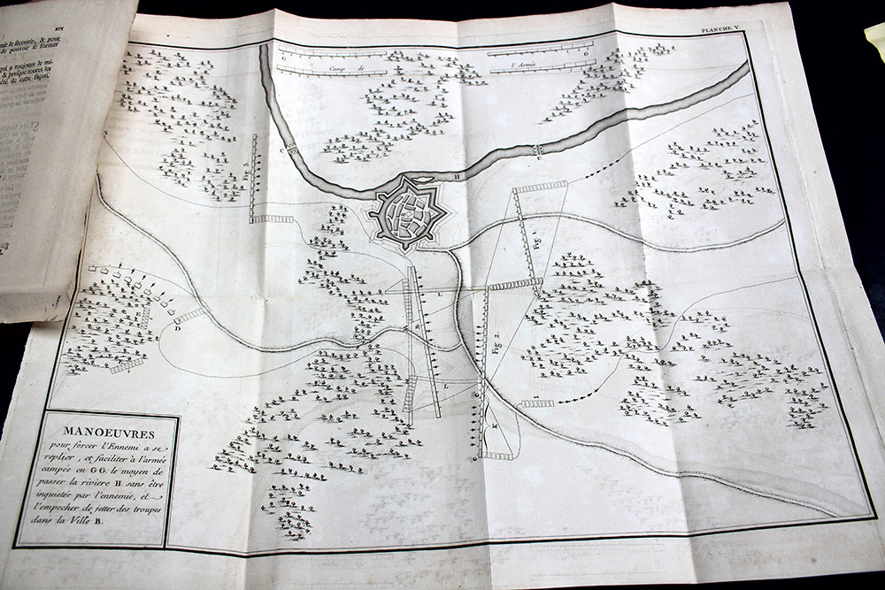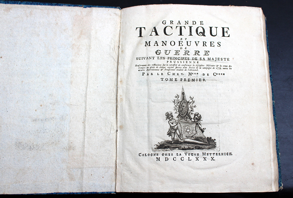 BOURSCHEID, Johann Wilhelm von. Grande Tactique, et Manoeuvres de Guerre, Suivant les Principes de sa Majeste Prussienne. Colonia, Metternich, 1780. 4to, 2 parti in uno, 13 tavole ripiegate, vignetta xilografica al frontespizio. Legatura coeva in cartonato marmorizzato con tassello al dorso (difetti). Non collazionato e difetti da esaminare.