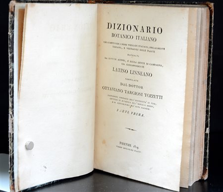 TARGIONI TOZZETTI O. Dizionario botanico italiano. Firenze, Piatti, 1809. 8vo, 2 parti in un unico volume, qualche lieve fioritura. Legatura coeva in mezza pelle con titolo in oro al dorso. Non collazionato e difetti da esaminare.