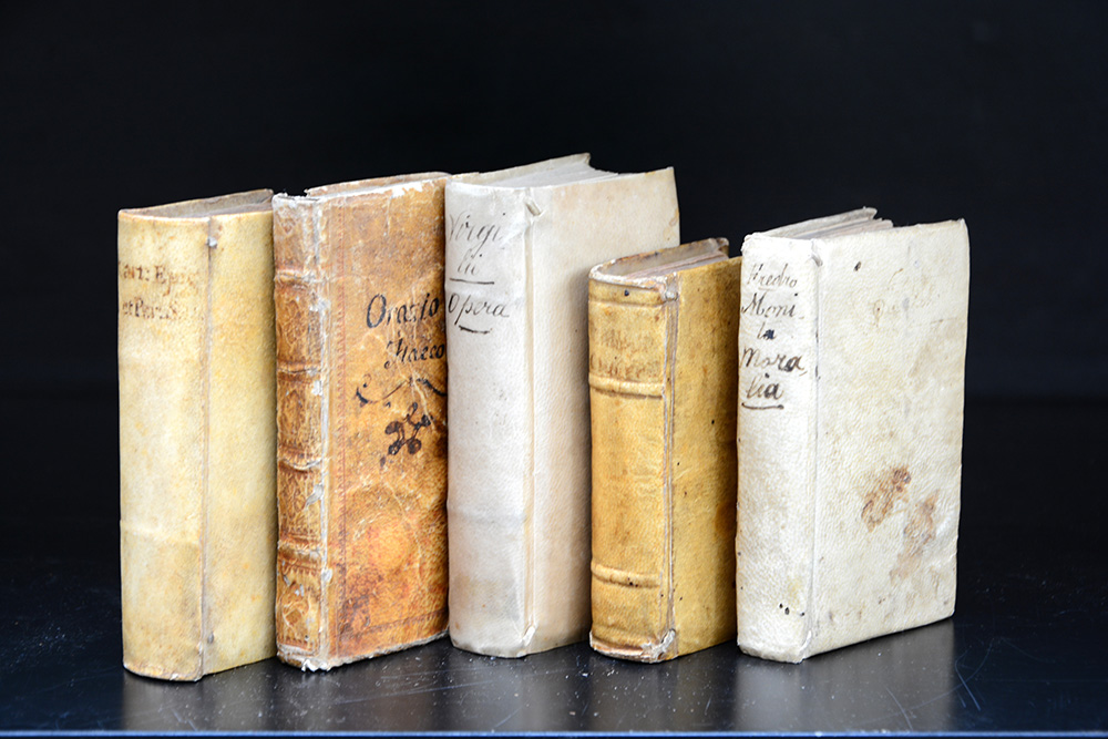 Una serie di libri in piccolo formato legati in pergamena che includono un...