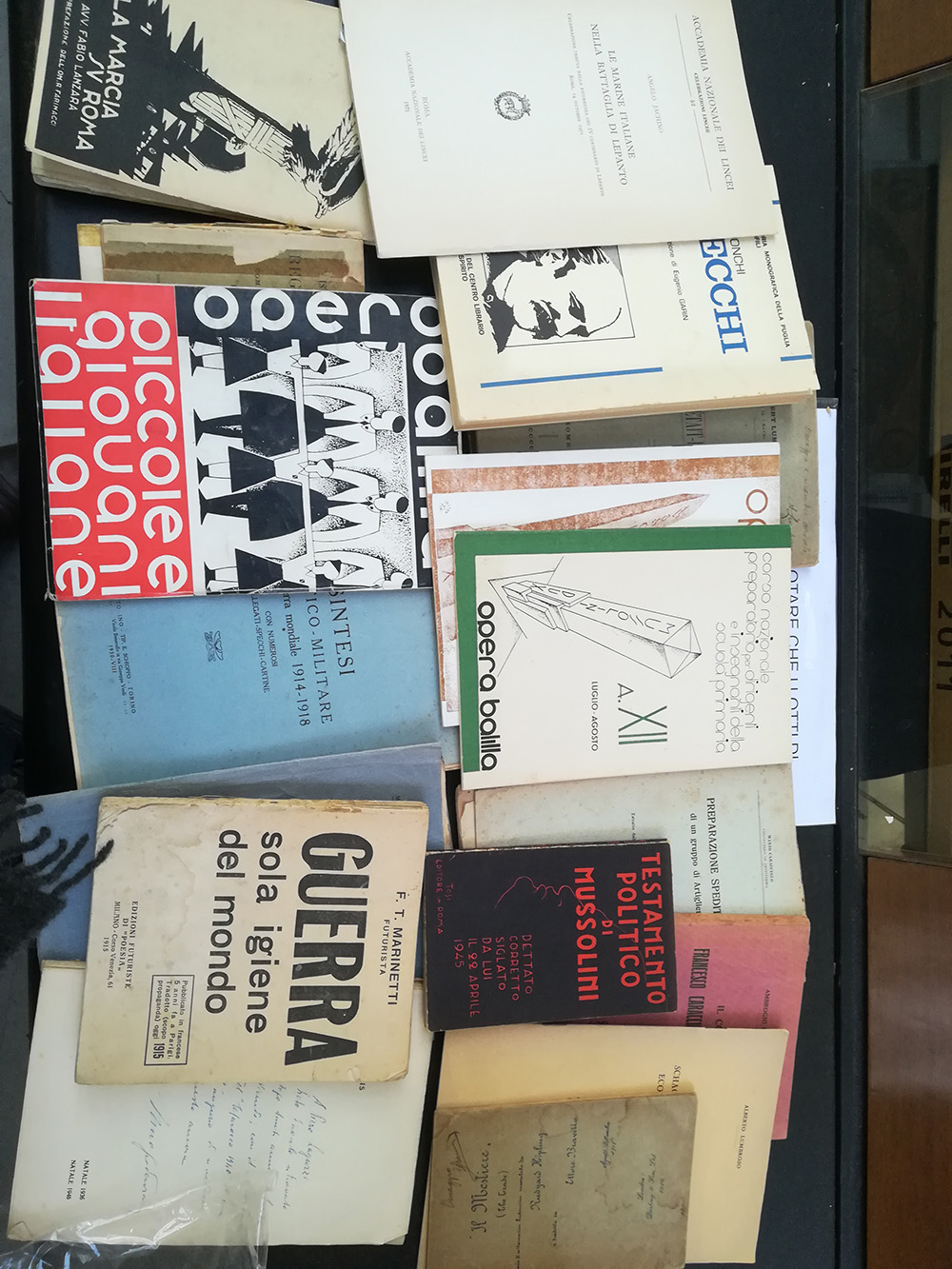 Lotto di numerosi libri di arte e storia del fascismo che includono: MARINETTI, Filippo Tommaso. Guerra sola igiene del mondo. Pubblicato in francese 5 anni fa a Parigi.Tradotto (scopo propaganda) oggi 1915. Milano, Edizioni Futuriste di 'Poesia' (Tipografia Ripalta), 1915 – Il Testamento politico di MUSSOLINI. "Dettato, corretto, siglato da lui il 22 aprile 1945", Roma, Tosi Editore, 1948. (difetti e mancanze). Non collazionato e difetti da esaminare.