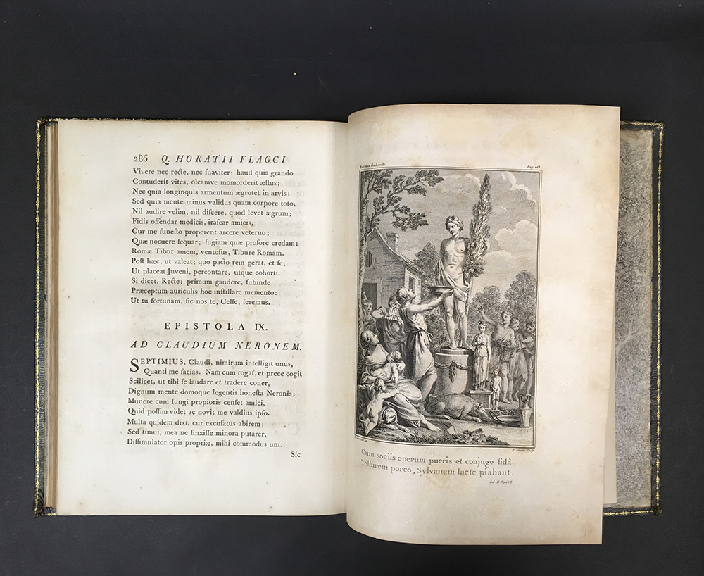 FLACCUS Horatius, Quintus. Opera. Birmingham: John Baskerville, 1770. 4to, antiporta incisa in rame e 4 tavole incise in rame, grande vignetta figurata incisa in rame al frontespizio. Legatura coeva in marocchino blu, piatti inquadrati da filetti in oro, titolo al dorso, dentelles interne a rotella in oro,tagli in oro zecchino, fogli di guardia e sguardia in carta marmorizzata. Le incisioni su disegno di H. Gravelot sono opera di vari incisori; la legatura potrebbe essere attribuita a Nicolas-Denis Derome le jeune. La prima delle opere di Baskerville sugli scrittori antichi; rara completa delle tavole
