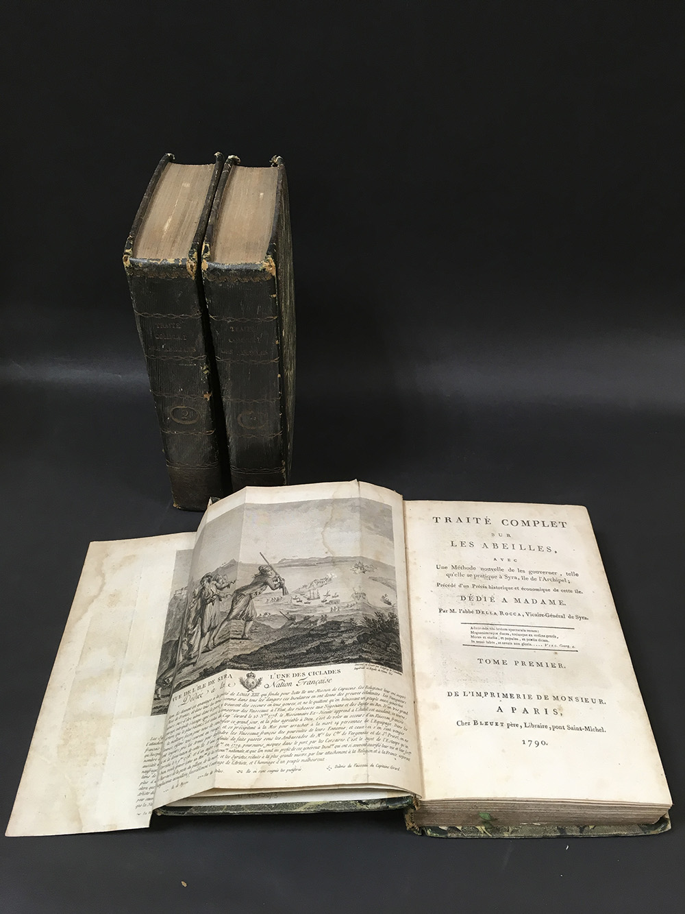 DELLA ROCCA, Abate. Traite complet sur les abeilles, avec une methode nouvelle de les gouverner, telle qu'elle se pratique a Syra, ile de l'Archipel. Parigi:Imprimerie de Monsieur, chez Bleuet pere, libraire,1790. 3 volumi, 8vo, una tavola disegnata e incisa in rame da Francois Godefroy, ripiegata più volte che rappresenta la baia e l’isola di Syra e 4 tavole fuori testo incise in rame. Legatura coeva in mezzo marocchino verde, con titolo e fregi in oro al dorso. Prima edizione (lievi difetti)