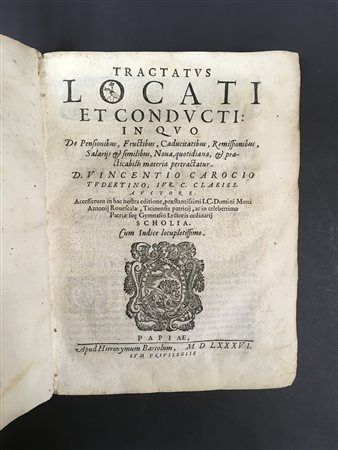 CAROCCI (o Caroccio), Vincenzo. Tractatus locati et conducti. Pavia: Hieronymum Bartolum, 1586. 4to, legatura coeva in pergamena floscia, titolo manoscritto al dorso (tracce di umidità e lievi difetti)