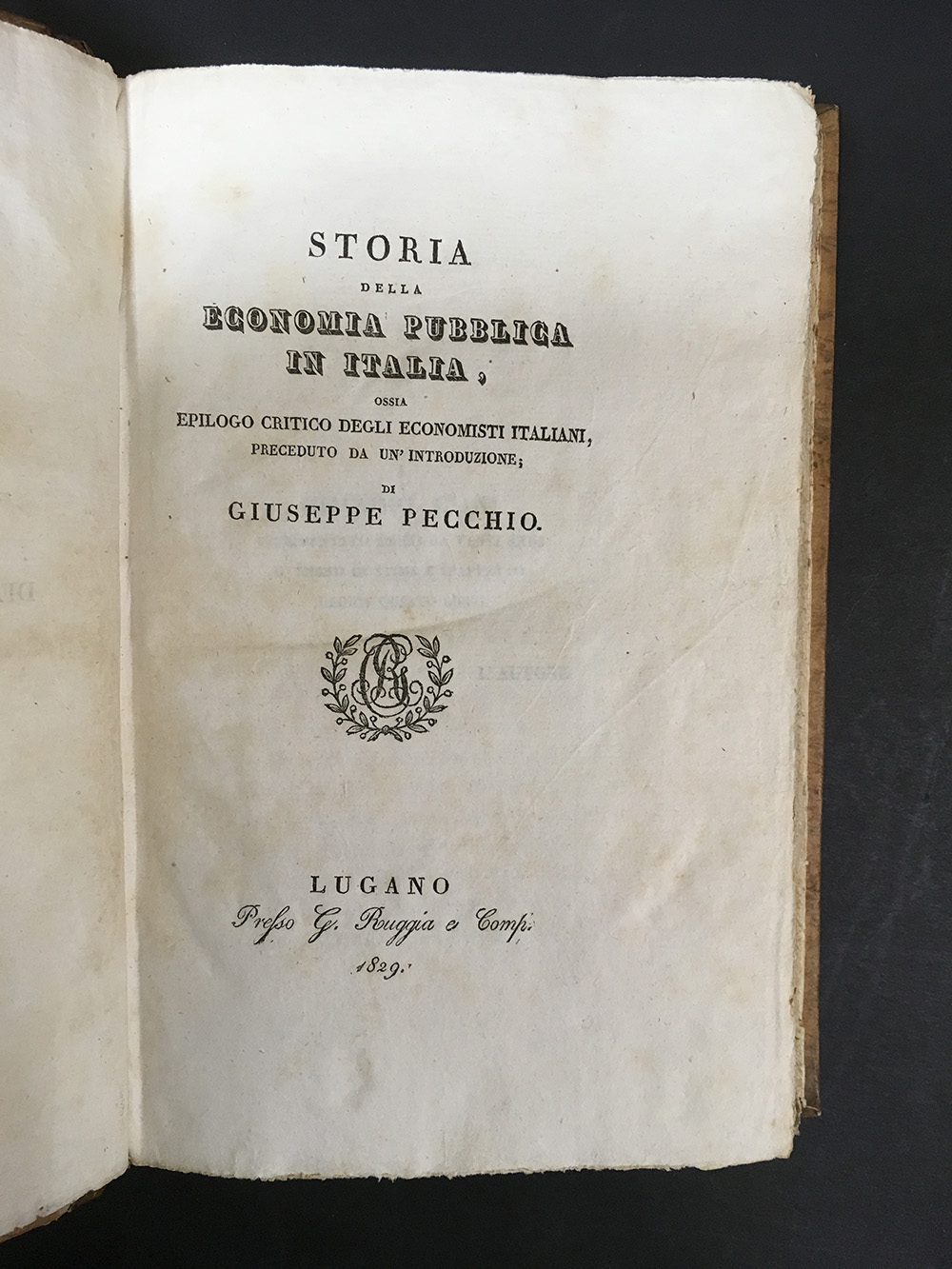 PECCHIO, Giuseppe. Storia dell'Economia Pubblica in Italia ossia epilogo critico degli economisti italiani. Lugano, G. Ruggia, 1829. 8vo, qualche macchia e fioritura. Legatura coeva, doros in pelle con titolo su tassello (lievi difetti). Interessante prima edizione di questo trattato che elenca i principali economisti italiani dell'epoca dei lumi.