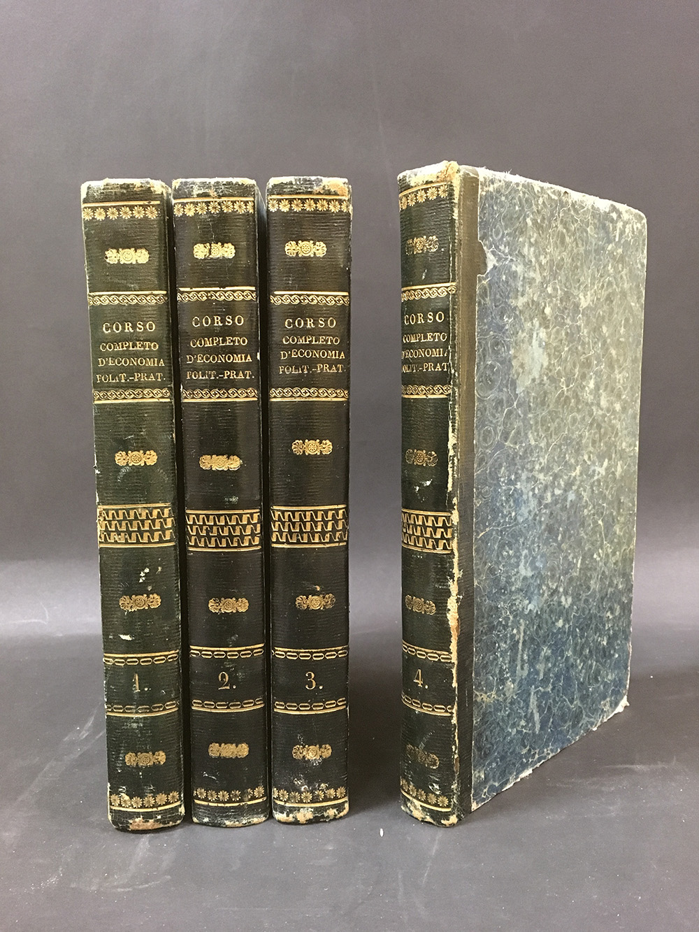 SAY G. Battista. Corso completo d'economia politico-pratica. Firenze, Battelli, 1833. 8vo, 4 voll, fioriture e macchie. Legatura coeva in mezzo marocchino con titiolo e decori in oro al dorso.