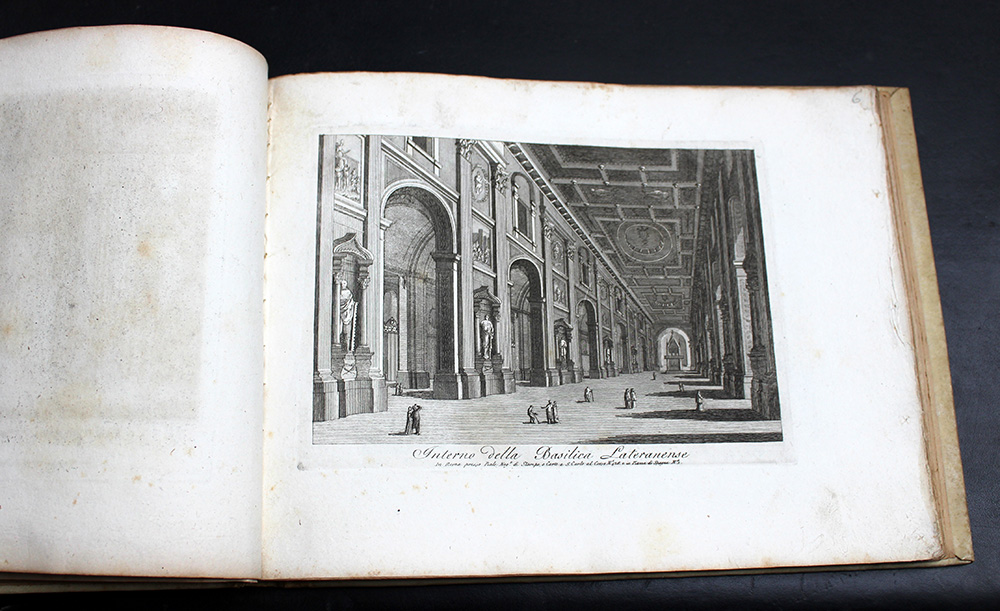 Vedute di Roma: una serie di 29 belle incisioni raffiguranti vedute della città di Roma. 4to oblongo. Legatura in pergamena posteriore con "Roma" in oro al piatto anteriore (difetti). Non collazionato e difetti da esaminare.
