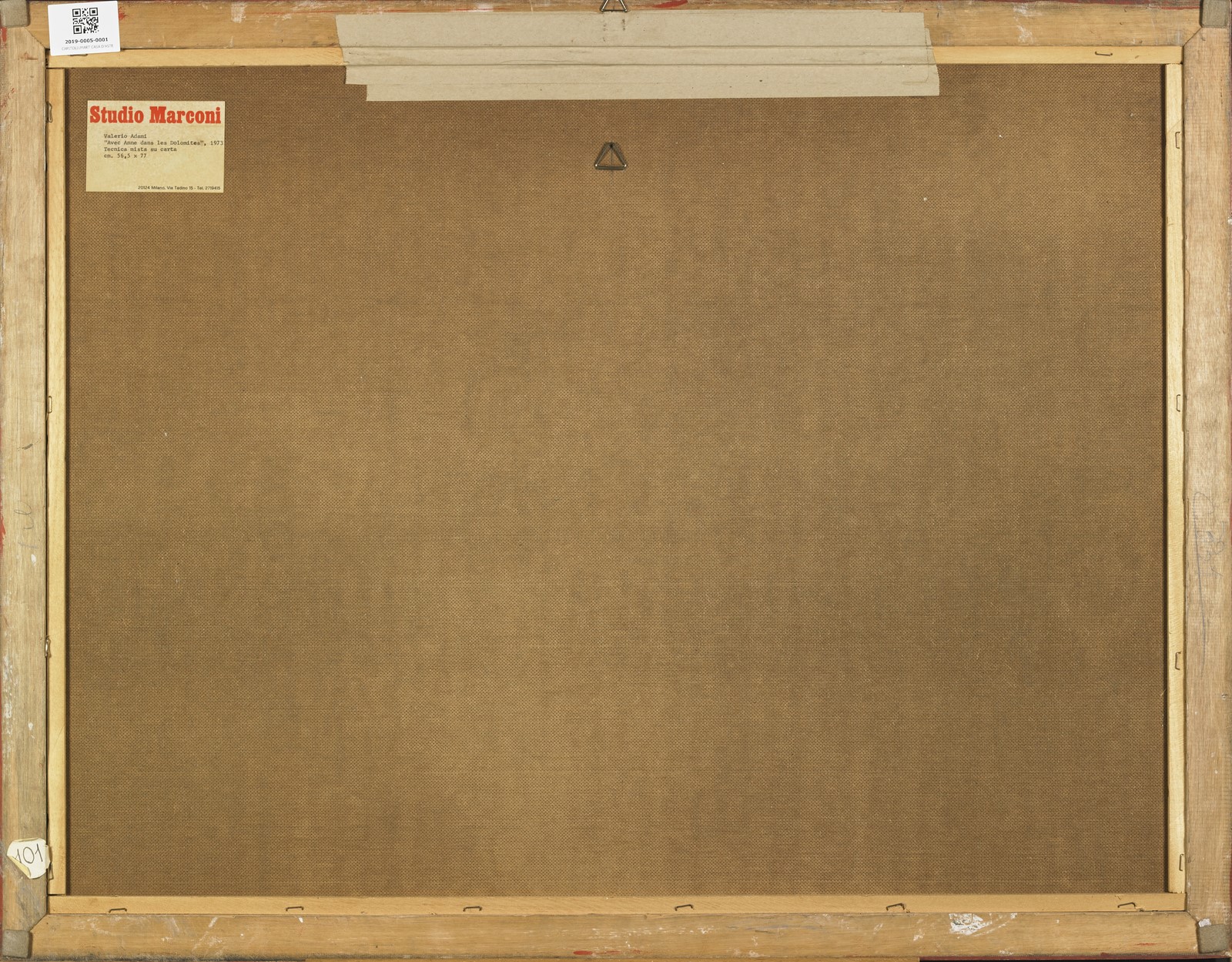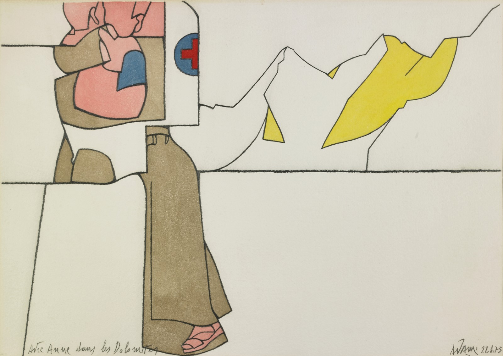 ADAMI VALERIO (n. 1935) Avec Anne dans les dolomites. 1973. Tecnica mista su carta. Cm 70,00 x 50,00. Firma e anno in basso a destra. Titolo in basso a sinistra. Al retro cartiglio descrittivo Studio Marconi, Milano. Certificato di autenticità Gio' Marconi, Milano. Cornice presente