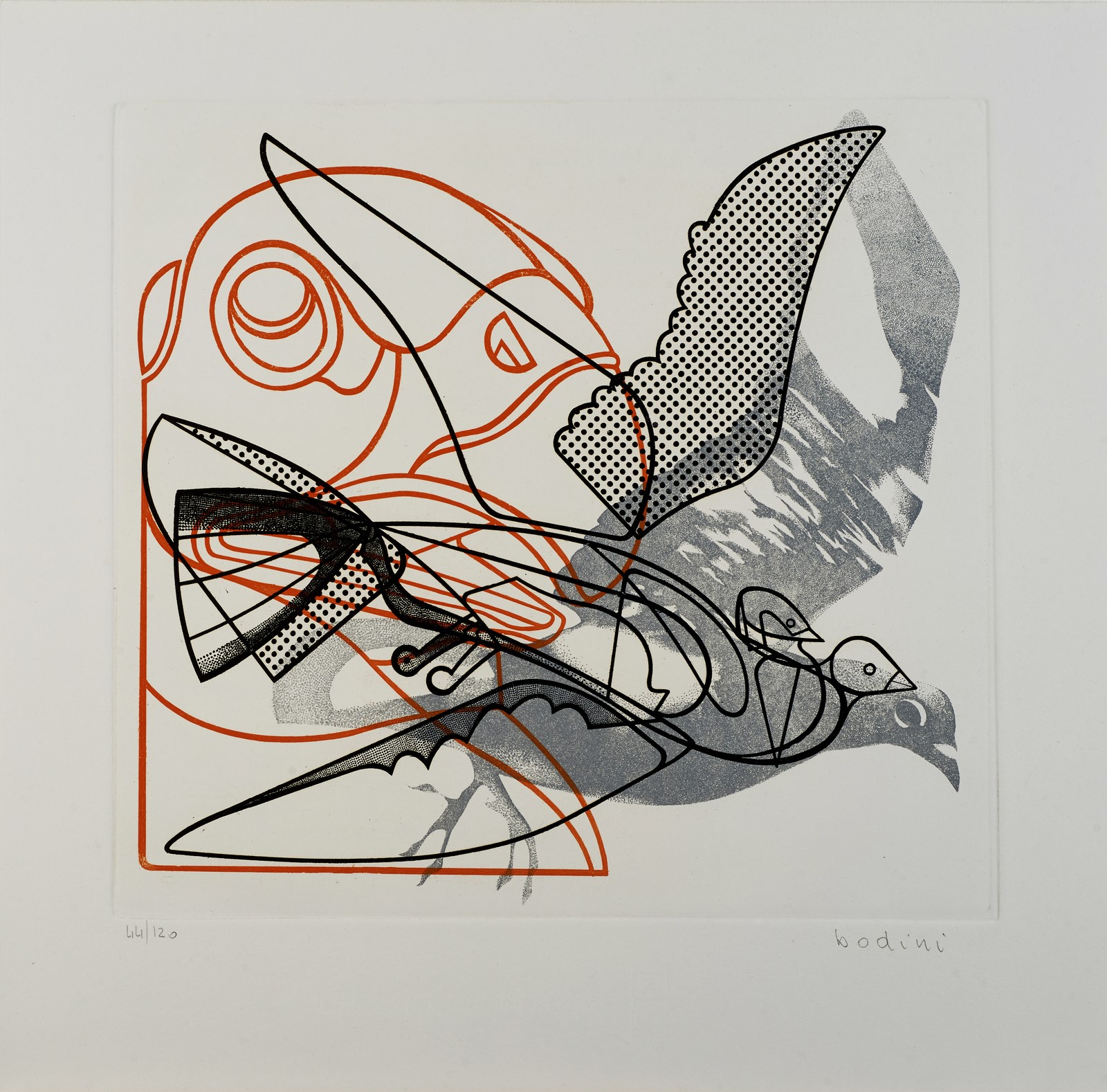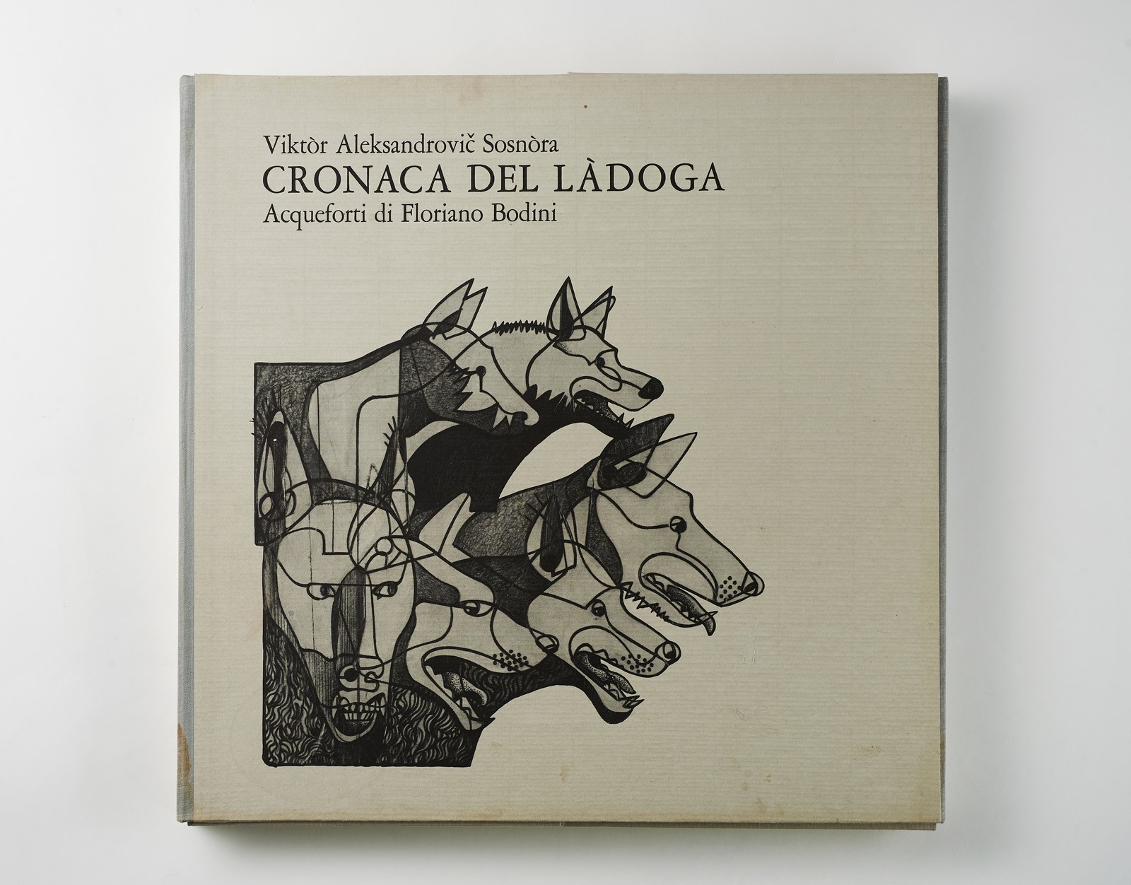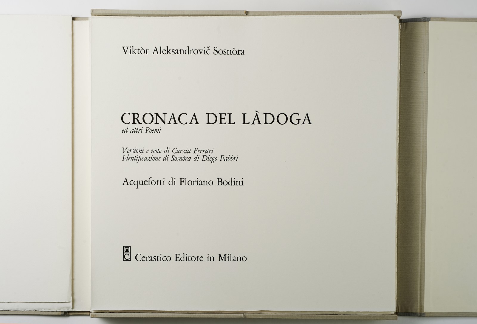 BODINI FLORIANO (1933 - 2005) Cronaca del làdoga. Libro d'arte. Cm 42,00 x 42,00. 44/120. Libro di Viktror Aleksandrovic Sosnora, Cerastico Editore, Milano contenente n.6 acqueforti di Floriano Bodini firmate e numerate in basso a matita. Confezione originale.