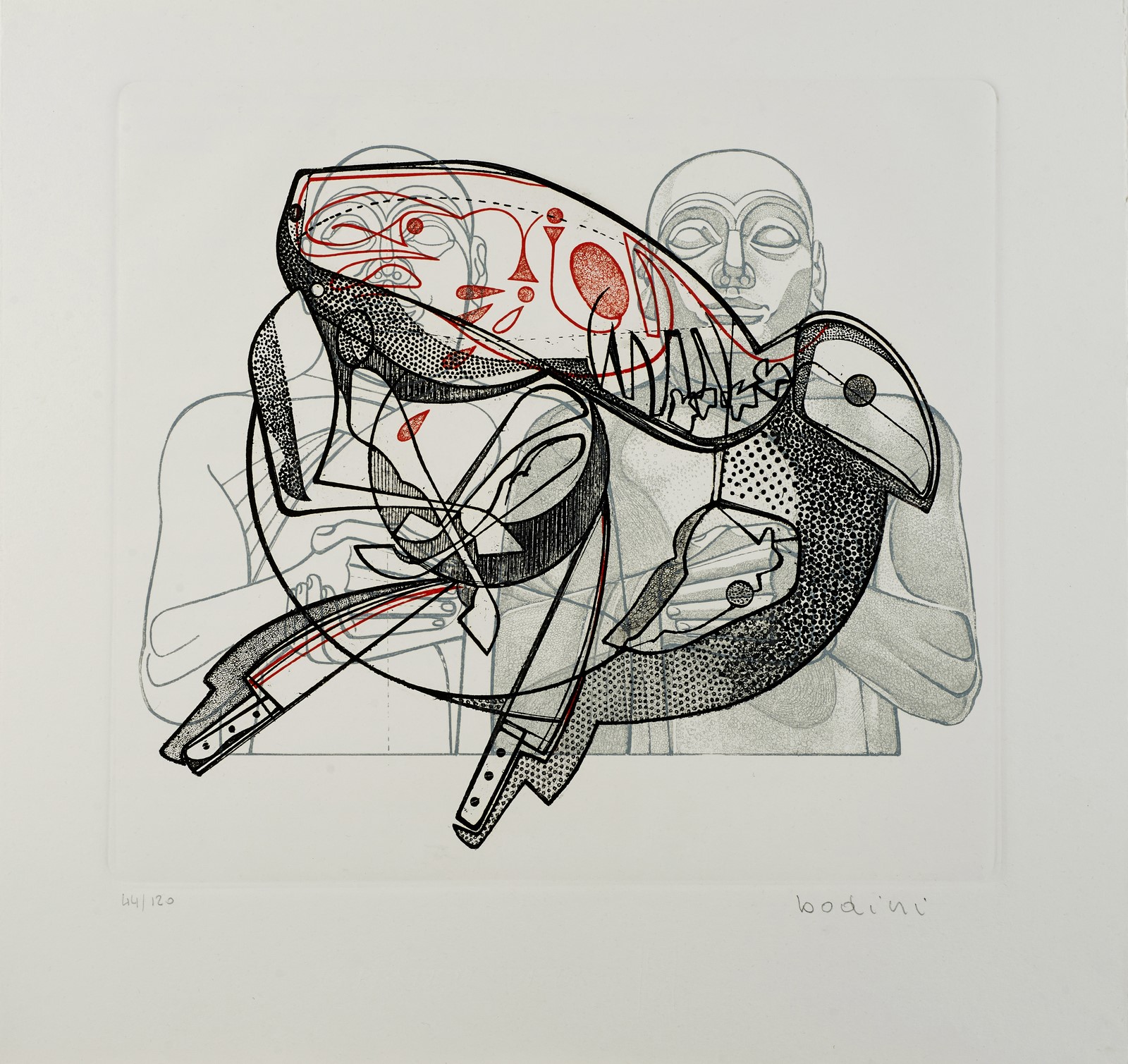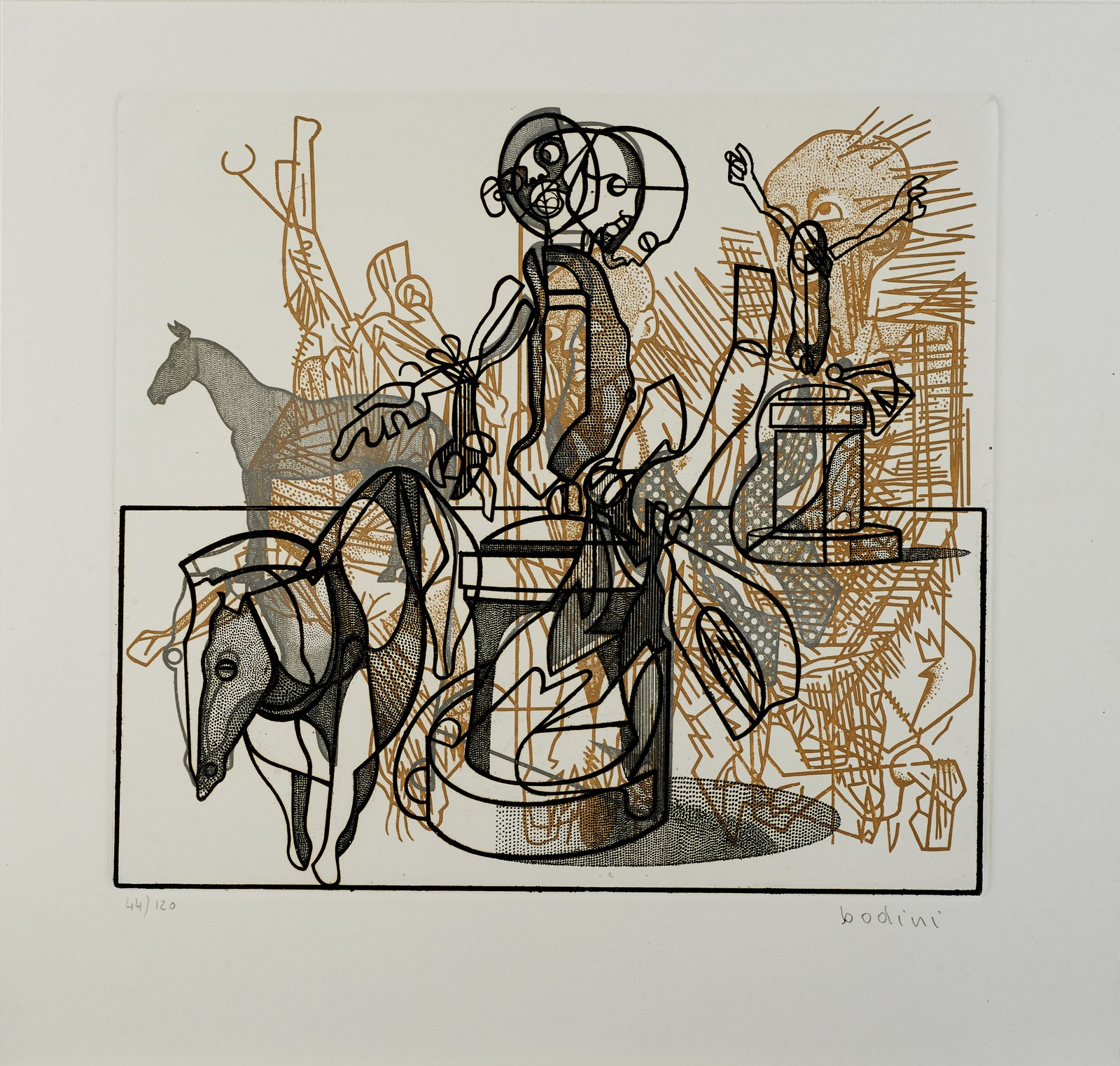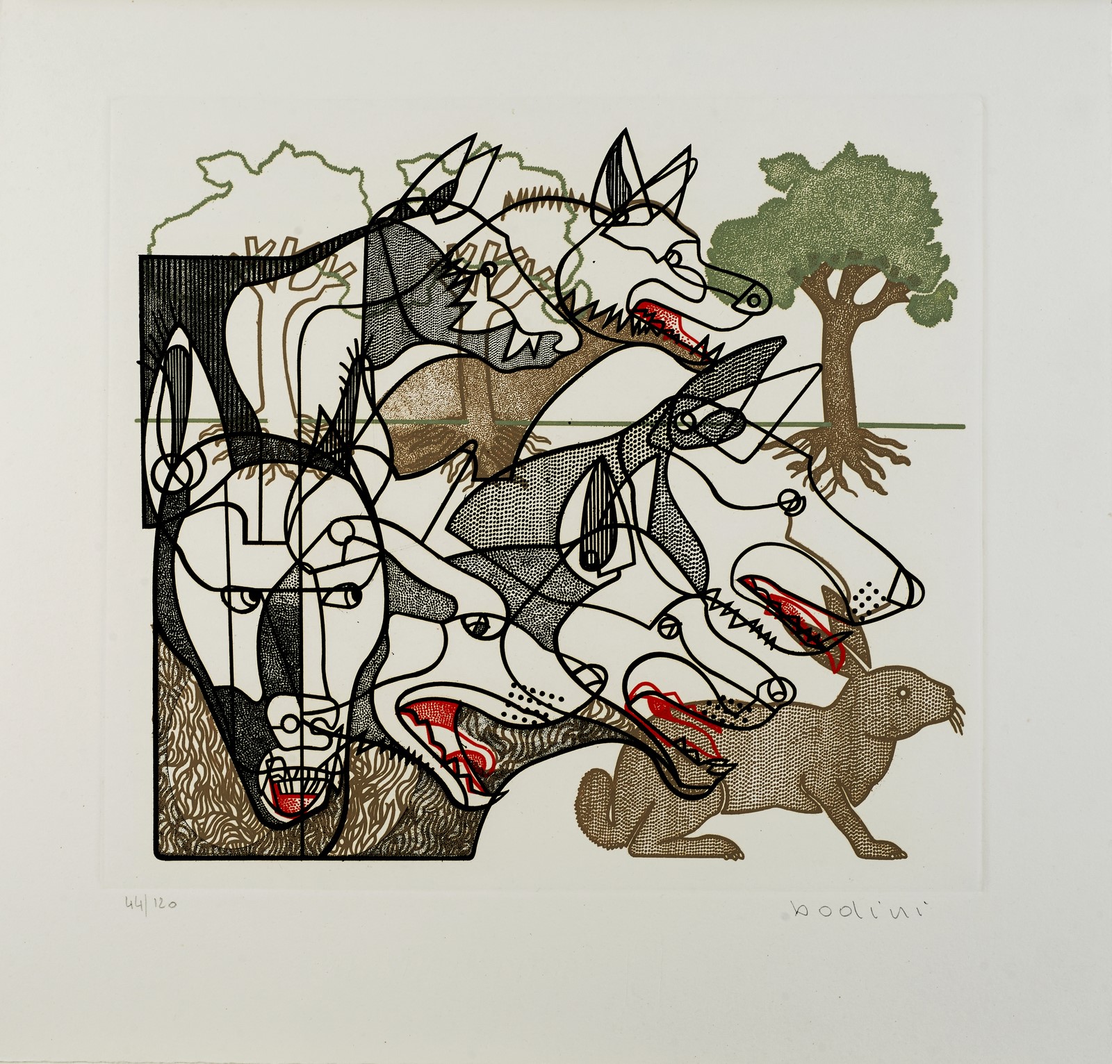 BODINI FLORIANO (1933 - 2005) Cronaca del làdoga. Art book. Cm 42,00 x 42,00. 44/120. Book by Viktror Aleksandrovic Sosnora, Cerastico editor, Milan. Within there are n. 6 eatchings of Floriano Bodini. All graphics are signed and numbered lower in pencil. Original box.
