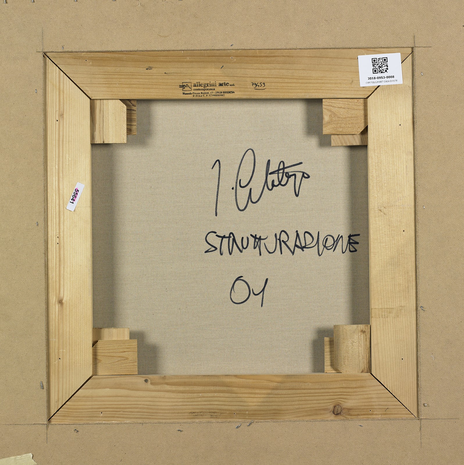 COSTALONGA FRANCO (n. 1933) Strutturazione. 2001. Olio su tela . Cm 50,00 x 50,00. Al retro firma, titolo e anno. Autentica dell'artista su fotografia.Provenienza: Allegrini Arte Contemporanea, Brescia. Presenti lievi difetti. Cornice presente