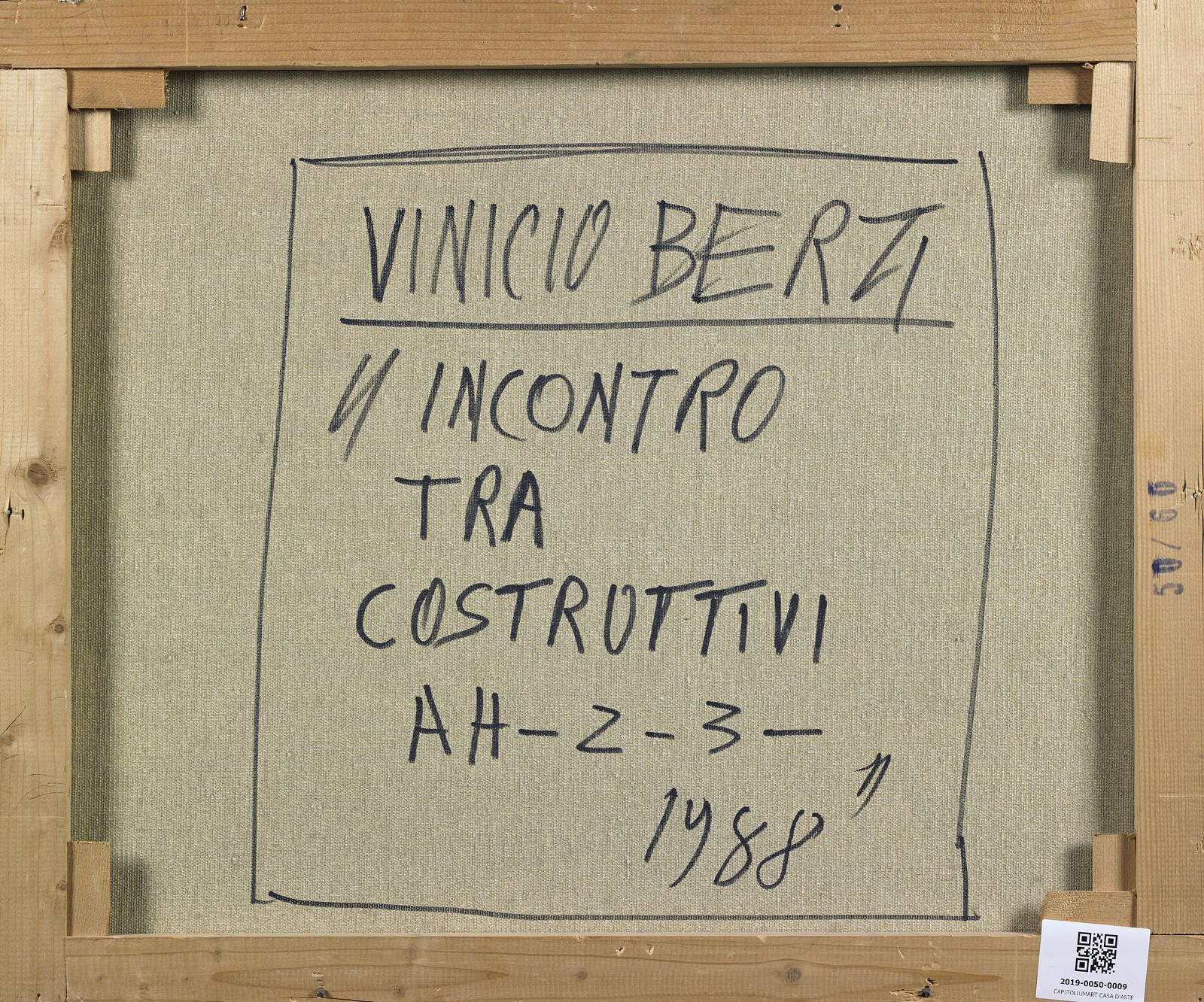 BERTI VINICIO (1921 - 1991) Incontro tra costruttivi AH 2 -3. 1988. Olio su tela . Cm 60,00 x 50,00. Firma e anno in basso a sinistra. Al retro titolo, frima e anno. Cornice presente