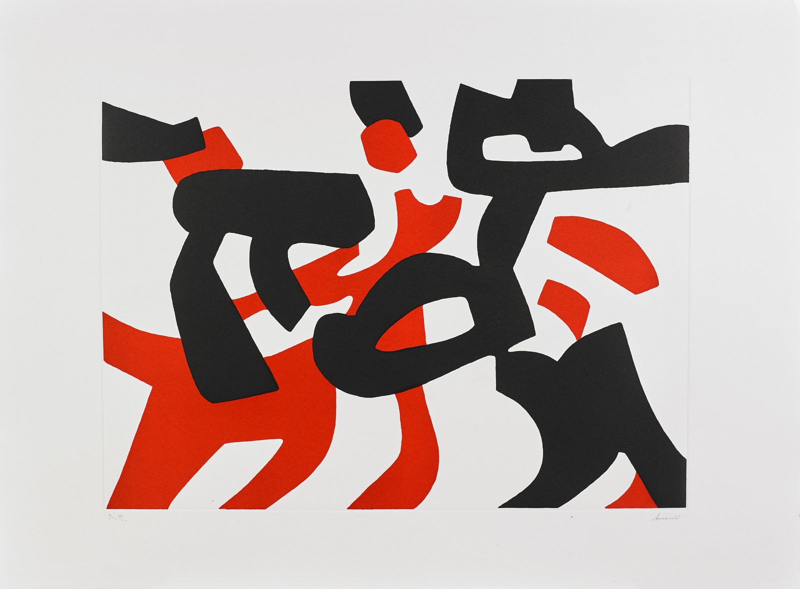 ACCARDI CARLA (1924 - 2014) Abstract composition in black and red. 2001. Etching, aquatint. Cm 76,00 x 56,00. P.a. Edition adn signature lower in pencil. Rubinart editor, Rome stamp lower left. Magnani di Pescia filigree. Plate size: 40.5x55 cm. Roberto Bilanceri Gallery authenticity certificate.