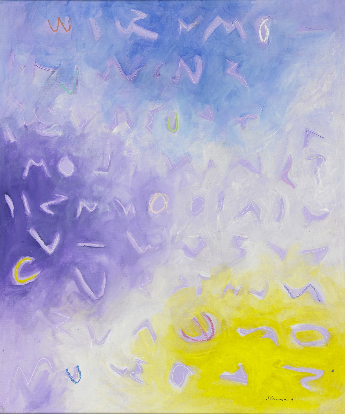 NUCARA RENZO (n. 1955) Scrittura. 1981. Acrilico su cartone telato. Cm 50,00 x 60,00. Firma e anno in basso a destra. Al retro titolo, firma e anno.