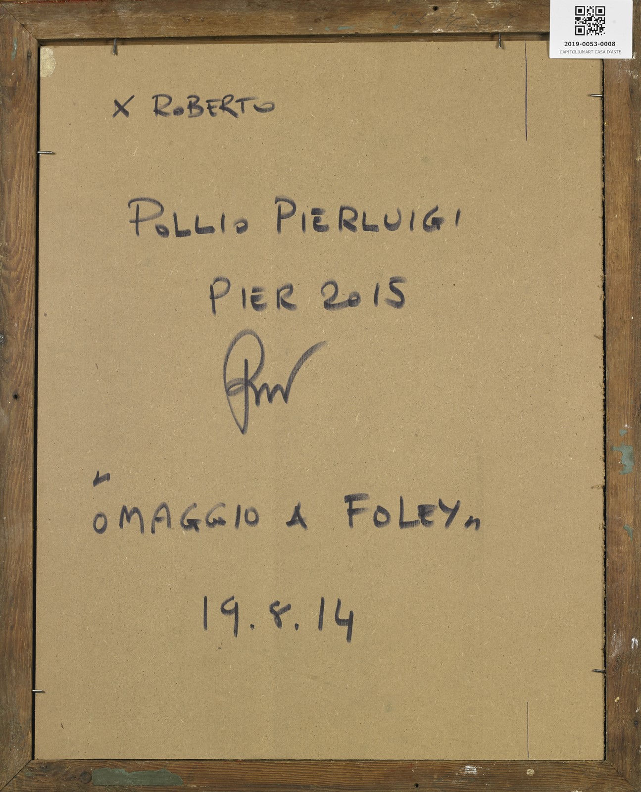 POLLIO PIERLUIGI (n. 1956) Omaggio a Foley. 2014. Tecnica mista e collage su cartone. Cm 35,00 x 46,00. Al retro titolo, firma, dedica e anno. Cornice presente